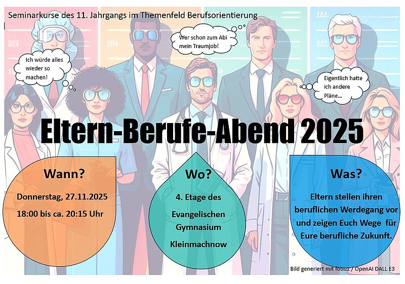 Als Teil der Berufsorientierung unserer Schülerinnen und Schüler hat auch in diesem Jahr unser Eltern-Berufe-Abend stattgefunden, bei dem Eltern unserer Schulen einen sehr persönlichen Einblick in ihr Berufsfeld und vor allem auch ihren Weg dorthin gegeben haben. Erstmals dabei war auch eine Vortragsschiene mit ehemaligen Schülerinnen und Schülern des Evangelischen Gymnasiums, die hautnah berichteten, wie es nach der Schule für sie weitergegangen ist. In insgesamt sechzehn Vorträgen konnten dabei unsere Schülerinnen und Schüler des 11. Jahrgangs zusammen mit Interessierten aus dem 10. Jahrgang verschiedenste Beruf kennerlernen und Fragen stellen: Von Biologie zur Radiologie, von der Gerichtsvollzieherin bis zum Richter, vom Bundesfreiwilligendienst bis zum Musikmanagement war für jede/n etwas dabei.